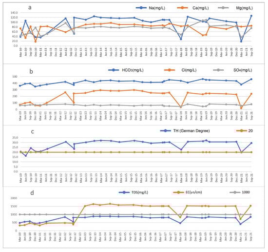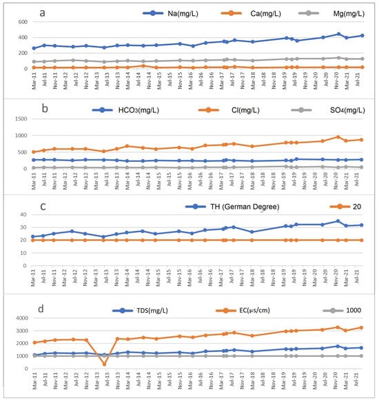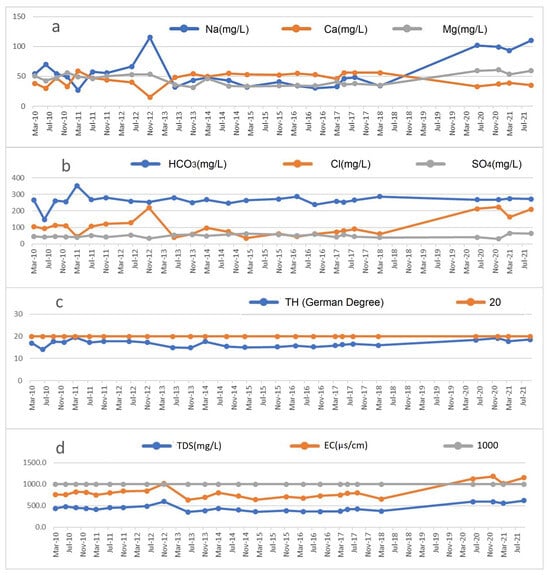 - The values of Mg2+ and Cl− ions contents and EC do not satisfy the drinking water quality standards.