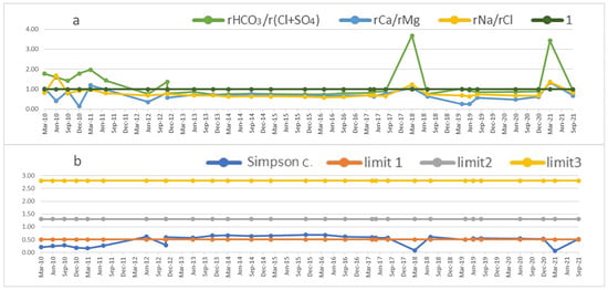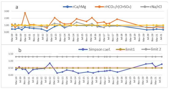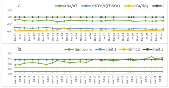 - Simpson’s coefficients give evidence to the advance of the seawater intrusion in the aquifer. This is also confirmed by the variations of the hydrochemical ratios r(Na+/Cl−), r(Ca2+/Mg2+) and r(HCO3−/(SO42− + Cl−)).