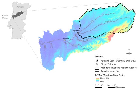 Location of the Aguieira reservoir and the corresponding watershed in the Mondego River Basin (in Portugal).