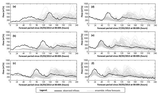 Comparison of the ensemble inflow forecasts to the Aguieira dam, in the 6 days before to the flood that occurred on 30 March 2013, with the corresponding observed inflows.