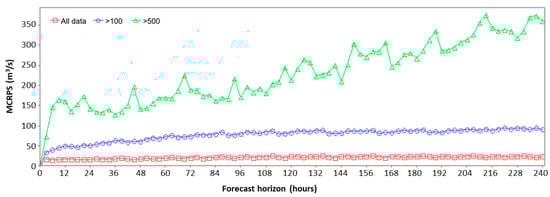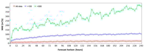 The results of the MAE statistical metric are shown in Figure 4. As can be inferred from Figure 4, and as would be expected, the MAE values increase with time over the forecast horizon, as well with the reduction of the data sampling size, taking into account the samples with data above the established thresholds. Considering the full dataset, the errors ranged from 15 m3/s to approximately 30 m3/s. On the other hand, considering the sampling data sets above the defined thresholds, the errors reached values close to the corresponding thresholds: 95 m3/s for the lowest threshold (100 m3/s) and close to 440 m³/s for the highest threshold (500 m3/s). The results for the initial period of forecast horizons are more strictly constrained by the initial conditions introduced in the prediction models, and therefore consistently report errors closer to zero.