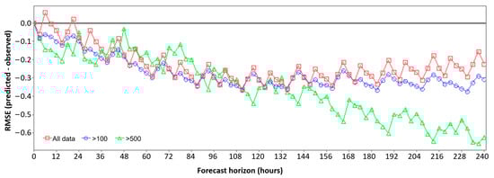 The results of the RME are shown in Figure 5. From the absolute values of the RME, it is noticeable that forecasts’ relative error increases with the forecast time horizon, especially up to approximately 120 h. From this prediction period onwards, the RME stabilizes for the complete data sampling set and for the sampling set with data above the lower threshold previously established. In effect, the RME values for the two sampling data sets prove quite similar throughout the forecast time period. For the sampling set with data above the highest threshold, the RME increases continuously over the entire forecast time period. Approximately, up to the 120th hour of the forecast horizon, the RME values for the three data sampling sets are similar.
