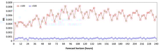 Figure 7 shows the results obtained for the BS index, which allows the evaluation of the error with which discrete events (such as the exceedance of a threshold) are predicted through the distribution of ensemble forecasts. Taking these results into account and similar to the previous observations for the MAE and MCRPS statistics, the BS results also exhibit a general increase of the forecast errors with the increase of the forecast horizon. However, the analysis of this index indicates that there are more errors in the forecast of the exceedance for the lower threshold than for the upper threshold. Even so, the maximum value reached by this index was approximately 0.08, which is a value very close to the optimal result (BS = 0). These results lead to the conclusion that actual occurrences of inflows above the defined thresholds have a very high probability of being correctly predicted by means of the ensemble forecasts.