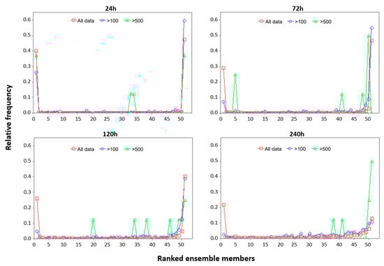 The Rank Histograms corresponding to different forecast horizons are presented in Figure 8. As can be seen in this figure, for the shortest forecast time displayed (corresponding to 24 h) the histogram generally displays an “U” format, which indicates that the corresponding observations frequently occurred above and below the ensemble forecasted range of values. However, in these cases a slight negative bias (rightward shift) is observed, which corresponds to the existence of more cases in which the observed values were above the ensemble’s maximum value, rather than below the minimum value. As the forecast time increases, there is a greater tendency for histograms to take an “inverted L” format, which indicates that the bias of the analyzed data is clearly negative, that is, the observations were more often above than below the 75th percentile of the ensemble forecasts. This inference reinforces the conclusions previously obtained for the error measures calculated with the mean values of the ensemble forecasts, namely the RME analysis.