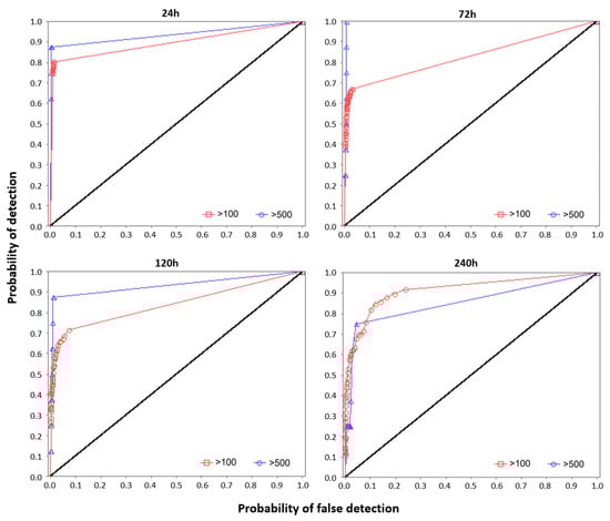 Figure 9 shows the ROCD diagrams for each of the two threshold sampling data cases considered, for different times in the forecast horizon period. Like the BS index, this statistical evaluation of the quality of ensemble forecasts also focuses on the occurrence of discrete events, corresponding to the exceedance of the defined thresholds. As is shown in Figure 9, all the data points in the four graphs are located below 0.3 (on the abscissa axis), which means that the number of forecasted events above the pre-defined thresholds that were not effectively observed is small, i.e., that the probability of occurrence of false alarms in the analyzed forecasts is generally very low. However, according to Figure 9, probability of occurrence increases with the increase in the forecast time horizon and the order number of the ensemble members, which is also related to the ensemble’s forecasted range of values. Regarding the probability of detection of the magnitude of pre-established events, it does not change significantly with the time over forecast horizon, but it increases significantly with the rise in the order number of the ensemble members. According to the diagrams shown in Figure 9, the upper members of the ensemble forecasts present a probability of detection of the predefined events (occurrences above the established thresholds) above 70% and a probability of detecting false events below 30%.