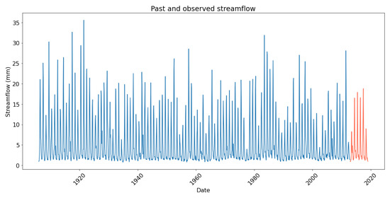 The evaluation of both tasks is done by repeating each model’s prediction 50 times to ensure their consistent performances on unseen data. In addition, we used multiple techniques to test the generalization capability of the models and ensure the robustness of the results. Figure 5 illustrates the past and observed streamflow at Lees Ferry. The red line represents the ground truth (observations) that we aim to compare with our predictions, while the blue one shows the past streamflow at Lees Ferry in millimeter per month from December 1905 to January 2019. As shown in Figure 5, Lees Ferry experienced a severe lack of water in 2013 and 2018. As a result, the actual streamflow values from December 2012 to October 2013 differ from most values in the training dataset; therefore, this may cause a divergence between predictions and actual values and reduce the overall performance of our work. However, ML-based models should handle this issue by training more samples with low discharge values.