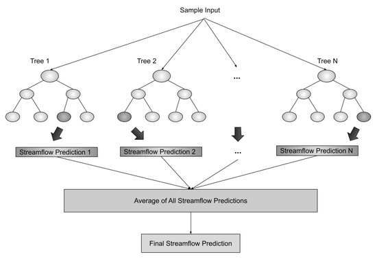 Random Forest Regression (RFR) is another model used for streamflow prediction, in which the ensemble learning method is used to forecast the future data [36]. A comparative analysis of different regression methods for predicting runoff signatures has been done by Ref. [37], where the result shows that the regression tree ensemble is superior to the multiple linear regression approaches, particularly in predicting dynamic flow signatures. Random Forest models result in better predictions with higher accuracy compared to other machine learning models such as Support Vector Machine (SVM) and Linear Regression [38,39,40].