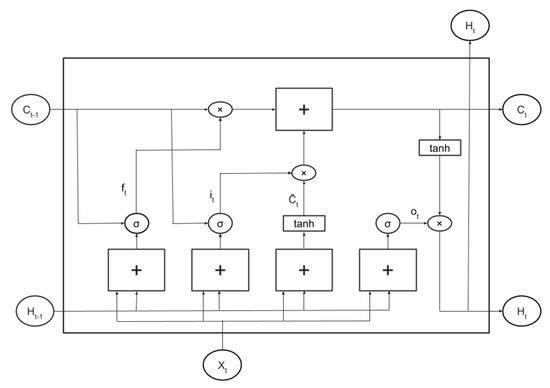 where is sigmoid function, is input vector at time t, is cell state and is hidden state. The Equations (3), (4) and (6) are the input, forget, and output gates, respectively. W represents weight and b denotes bias. Eventually, ∗ represents element-wise multiplication.