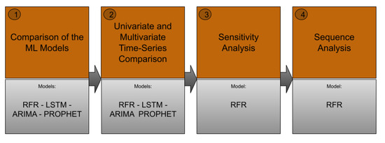 The experimental result section is presented in four subsections: (1) comparison of ML models, (2) univariate and multivariate time series forecasting, (3) sensitivity analysis, and (4) sequence analysis. Figure 8 shows the flowchart of the experiment design in this paper. In each subsection, we will discuss different models and evaluate their prediction performances.