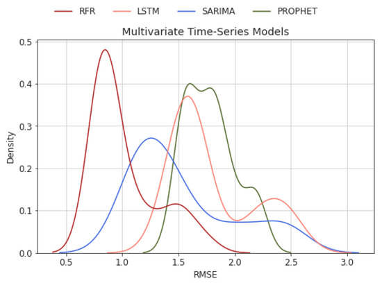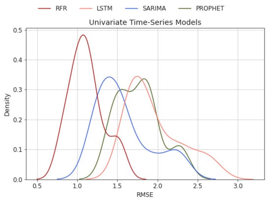 First, we demonstrate the RMSE of our models as a normal distribution to compare them qualitatively. As shown in Figure 9, RFR has the least RMSE among the four models. Both the median and average RMSE in RFR is less than 1.1 mm/month, which indicates RFR’s superior performance in this experiment. In addition, SARIMA performed well, resulting in low RMSE on average. On the other hand, LSTM and PROPHET performed the worst, where the median and average RMSE are in the range of 1.79 and 1.82 mm/month. Furthermore, the predictions of all models have low variance, which means that there are only a few unsatisfactory predictions out of 50 trials. To be specific, the predictions of the models are well-generated and robust.