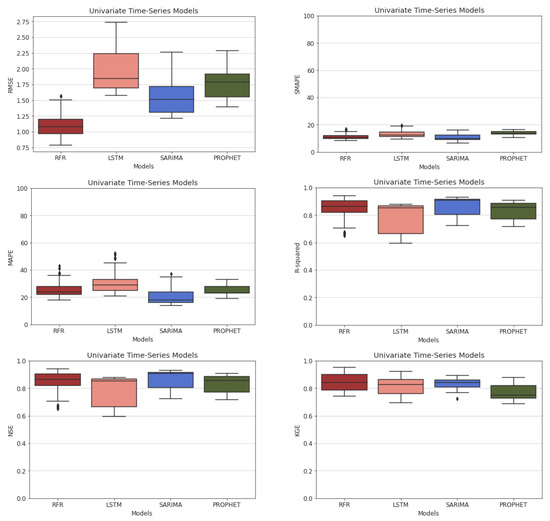 Figure 10 illustrates all metric values for those models over 50 trials in box plots. Each box plot contains the corresponding metric values of 50 trials of the forecast on the test dataset. RFR and SARIMA show less SMAPE and MAPE since their predictions are very close to the observations. This can be further justified by comparing RMSE values. RFR shows a better RMSE, while SARIMA is superior considering the MAPE. In addition, R-squared allows us to observe the relationship between the independent variable (time) and the dependent variable (discharge). It reveals how well the model predicts against the ground truth. The first observation is that the predictions of SARIMA follow the ground truth more precisely than the other models. The predictions of LSTM result in smaller R-squared values, and come with higher variance in comparison with other models. Nevertheless, a smaller R-squared does not necessarily mean that we have an inapplicable model. Considering other criteria such as RMSE and MAPE along with the R-squared assures a fair evaluation. Eventually, RFR and SARIMA show outstanding result with mean NSE and KGE of 0.85. Therefore, RFR and SARIMA are very competitive in univariate time-series prediction.