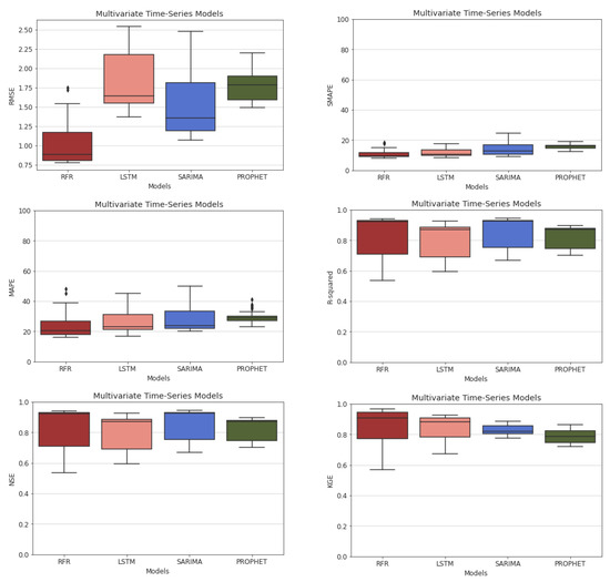 The box plots of all performance metrics for each ML model in the multivariate case are shown in Figure 12. RFR has a higher median in R-squared, but it has a high variance. We observe that the predictions of RFR follow the ground truth more precisely than the other models. Most of the R-squared values for all models are high enough to approximate the ground truth. According to the definition of R-squared, the result of 0 means that the quality of the predictions is worse than setting a straight horizontal line among the data points. In this regard, the prediction values of our models are satisfactory, since the mean R-squared of 0.92 for RFR represents sufficient accuracy. Additionally, we compared the predictions in terms of SMAPE and MAPE metrics, which show that RFR and LSTM are superior to the other models. NSE and KGE improved to 0.86 in RFR multivariate time-series predictions.