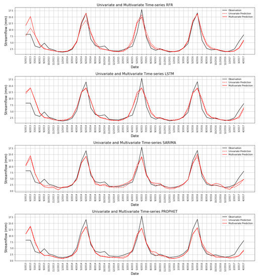 Considering previous works of streamflow prediction, we select a set of statistical, machine learning, and deep learning models for comparing their performances, and to choose the best model that can help hydrologists in effective streamflow forecasting. Therefore, our analyses cover four different ML models: Seasonal Auto-Regressive Integrated Moving Average (SARIMA), Prophet (PROPHET), Random Forest Regression (RFR), and Long Short-Term Memory (LSTM). Later, we consider meteorological components such as temperature and precipitation as new features to find potential improvements to the models mentioned earlier, since the studies indicate that temperature and precipitation are among the most fundamental indicators that can influence the climatic changes of the water bodies. In this regard, we aim to understand the impact of those factors on the streamflow prediction. Therefore, we analyze multiple approaches for streamflow forecasting. Our first approach consists of analyzing univariate data. For this, we only consider historic streamflow data to forecast the future streamflow data. Our second approach consists of employing more features rather than using solely historic streamflow data. This approach is an instance of multivariate time-series analysis, in which the model contains multiple time-dependent variables. An example of related multivariate analysis is the snow flow prediction that used hybrid models trained by meteorological data [53]. Moreover, Ref. [54] shows that streamflow predictions using SVMs were improved when considering atmospheric circulations. In addition, Ref. [55] concludes that the Pacific sea surface temperature provides us with better streamflow predictions in the Upper Colorado River Basin. Eventually, we pick the best model to perform further analysis, and evaluate in more detail using sequence analysis. We also performed a sensitivity analysis to explore the robustness of the model. The former is done to find the impacts of lead-time, which can result in different accuracies, and the latter is performed since there is a need to evaluate the robustness of the models with the presence of noise in data.
