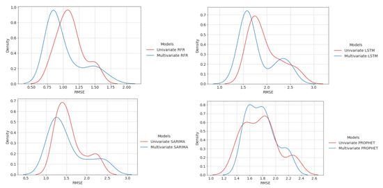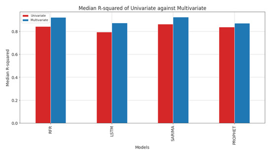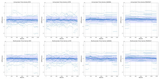 Figure 13 demonstrates predictions against the ground truth of 24 months ahead for 2 trials in both univariate and multivariate cases, which include the periods of May 2013 to April 2015, and from May 2015 to April 2017. It is worth mentioning that Figure 13 shows a subset of the testing period that starts from December 2012 and ends in January 2019. Visually, all models are prominent and decent. For the sake of fair evaluation of the performance of models in detail, we employed the previously-mentioned metrics and repeated them over 50 different test datasets to validate our results. As it had been estimated earlier, we observed higher errors in predictions starting from December 2012 to October 2013. However, the rest of the predictions had a lower error margin, as shown in Figure 16.