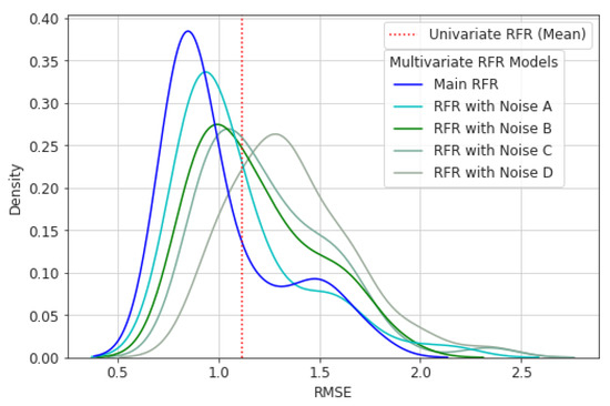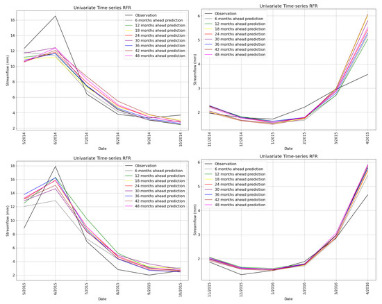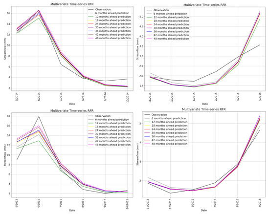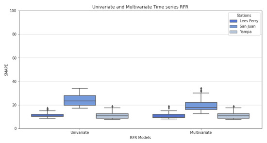 Both univariate and multivariate time-series models demonstrated decent results in predicting streamflow of 24 months lead-time. This subsection aims to compare the performances in univariate and multivariate cases of all ML models. In other words, the purpose of this experiment is to discern potential improvements in predictions while considering meteorological components of the Upper Colorado River Basin along with the past streamflow. We hypothesize that the monthly temperature and precipitation of the Upper Colorado River Basin may affect the streamflow in the Colorado river, in particular the Lees Ferry site. In this subsection, we experimentally validate that hypothesis. Figure 14 shows the RMSE distributions of all 50 trials for both univariate and multivariate time-series models. Multivariate time-series RFR shows improvement in the RMSE plot by reducing the error. Consequently, we conclude that considering the temperature and precipitation of the Upper Colorado River Basin minimizes the error in the prediction of streamflow using RFR. Likewise, LSTM has less RMSE in its multivariate time-series model than its univariate counterpart.