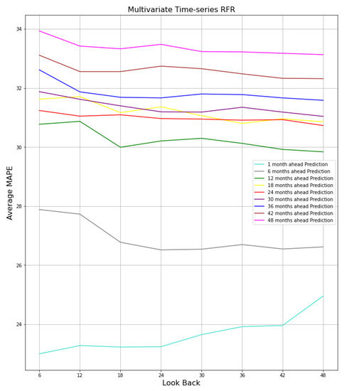 We performed hyperparameter tuning to build the optimal models. RFR was trained with 1000 estimators, minimum samples split of 2, minimum samples leaf of 1, maximum depth of 8, and with bootstrapping. In addition, the random state is fixed to generate the reproducible result. Different lengths of look-back windows were studied to find the best possible one. As a result, it was set to 24 as the best sequence for univariate time-series RFR.