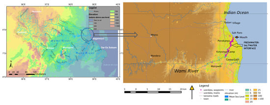 The Wami River arises in the Eastern Arc Mountains of Tanzania and flows into the Indian Ocean north of Bagamoyo (Figure 1 left). The last 20 km of the river starting from Gama Gate until its confluence with the sea constitutes the estuary (Figure 1 right), that witnesses a tidally and seasonally varying mix of freshwater and seawater []. The Wami Estuary is situated within Saadani National Park (SANAPA) and is the only estuary on the eastern coast of Africa to be protected within a national park, thereby still providing habitat to a large and diverse terrestrial and aquatic wildlife population. Average annual rainfall across the Wami River basin ranges from 550–750 mm in the highlands near Dodoma, 900–1000 mm in the middle areas near Dakawa and 900–1000 mm at the river’s estuary [], with the highest rainfall (>2000 mm) occurring in the Nguru Mountains. Dry periods typically occur from July to October (monthly rainfall under 50 mm) and wet periods from November to December (vuli rains) and from March to June (masika rains) []. August is the driest month in the basin while the highest rainfall amounts are mainly experienced in March and April []. Evapotranspiration in these humid tropics is of the same order as rainfall [].