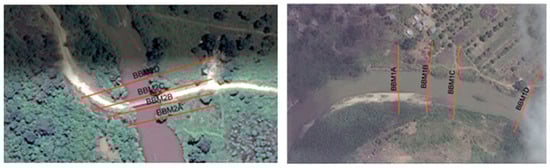 The geometric survey entailed accurately locating riverine mesohabitat (riffle, pool, run, etc.), survey of bed elevation, and establishment of survey control points. A geometric survey at each EFA site was carried out at all channel cross sections using theodolites, a staff, and an 100 m steel measuring tape. The cross sections were placed perpendicular to flow. The geometry of the cross section within the main channel, below the water line, was surveyed using the manual water depth sounding approach. The measuring tape stretched across the channel width was supported from steel pegs (survey reference points) anchored on the banks. The cross section transects were in sections of the river where the mesohabitat is homogeneous across the channel. The study river reaches began with a downstream hydraulic control or riffle. The right bank and left bank were designated when looking downstream, with the left bank designated headpin and right bank designated tailpin. Verticals used in depth measurements were spaced at 1 m interval along the transect. Since the surveys were conducted during the low flow season, it was possible to access the riverbed and hydraulic controls. The conducted surveys provided information such as distance between transects, water-surface elevation, bed-elevation profiles, stage of zero flow elevation, water depths, and benchmark locations and elevations. The cross section transect extends beyond the Highest Flood Marks (HFM) to the cross-section freeboard. Existing survey benchmarks in the EFA sites were used as reference elevations. The benchmark used for the transect headpin and tailpin elevation surveys served as benchmarks for water-surface elevation (WSL) measurements during hydraulic data collection. Additional cross sections were identified and surveyed—they were sited at changes in water slope and channel geometry and along the bridge axis (see Figures S2 and S3 in Supplementary Information). The river longitudinal profile was required to determine the channel slope. Ideally this was supposed to be determined as the ratio of the difference between thalweg (deepest point) elevations to river reach length. However, considering the uncertainty involved in capturing the cross section deepest points, water surface elevation difference was surveyed and used with the assumption that a nearly normal uniform flow condition prevails. A survey of the left overbank and right overbank reach lengths was carried out using 50 m tape measure. The transects and general locations of the EFA sites were recorded using a handheld GPS.