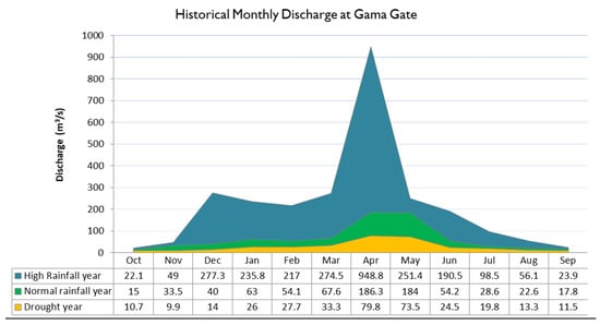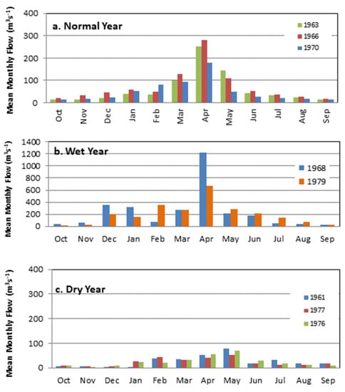 Mean Monthly Discharge (m3/s) in (a) normal, (b) wet and (c) dry years at Gama Gate, Wami River, Tanzania.