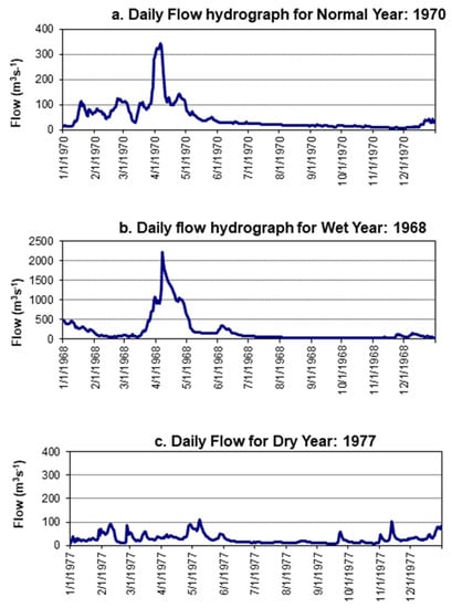 Daily flow hydrographs (m3/s) for (a) normal, (b) wet and (c) dry years at Gama Gate, Wami River, Tanzania.