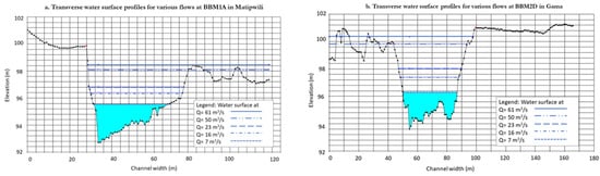 Channel cross-sections and simulated water surface profiles for different flowrates at (a) Matipwili and (b) Gama Gate, Wami River, Tanzania.