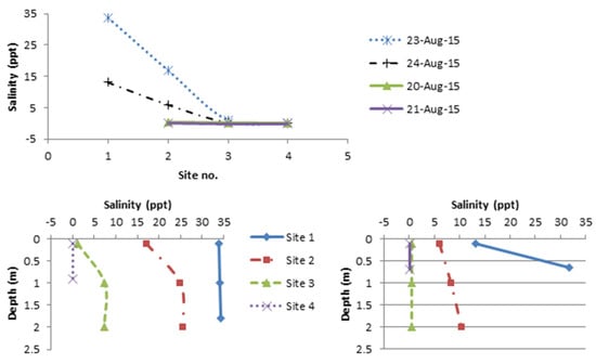 Top—Surface salinity profiles upstream from estuary mouth (sites 1–4), with Site 1 being at the mouth. Bottom—Depth profile of salinity during flood tide (23 Aug-15—left) and (24 Aug-15—right).