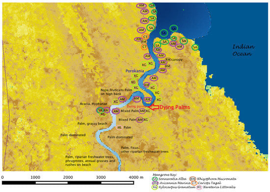 The plant species composition of a riparian forest is tightly coupled to the seasonal flow regime of the river and offers clues on the extent of flooding of banks, soil water availability and salinity occurring in the root zone (rhizosphere). An earlier report on the Wami Estuary [] described riparian vegetation zonation into three dominant plant communities based on salinity tolerance: