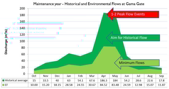 - Extrapolation of these values for other months to obtain a minimum set of environmental flow recommendations for each month, as measured at Gama Gate. This was done in a manner that replicates the seasonal variation inherent in the historical flow average data.