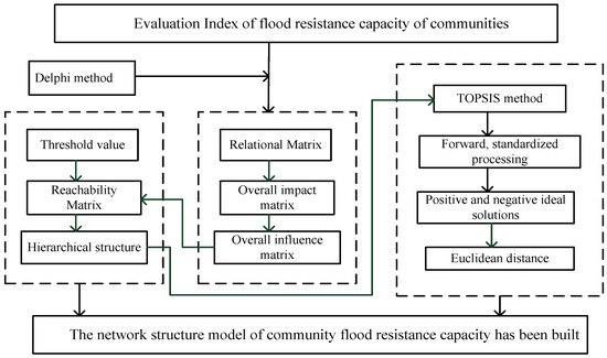 Many methods can be used to sort and prioritize indicators, including the AHP-fuzzy number method [30], the DEMATEL method [31] and the ISM method [32]. Different methods have their own advantages; for example, the AHP-fuzzy number method can compare the index priority, but mainly relies on the use of experts to score indicators based on their experience and expertise and therefore, the results are to some extent subjective. The DEMATEL method can analyze the causal relationship and importance of indicators, but for interrelated multiple indicators, the internal action path cannot be clearly explained. In conclusion, all of these methods have shortcomings when used alone, so we chose to use a combination of the DEMATEL-ISM method, as well as the TOPSIS method. The key factors affecting community resilience to flooding were first identified and then validated by conducting an example analysis. Before using these methods, it was necessary to first establish a community structure and hierarchy model to resist urban floods. This study proposes a comprehensive evaluation model to enhance community resilience to urban floods, covering the following objectives: