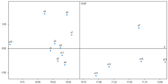 It can be seen from Table 4 that the DEMATEL method divides the 15 elements into two elements: cause elements and result elements. The sum of the influence degree and the affected degree of each element is called the centrality of the element, which represents the position and role of the element in the system. The difference between the influence degree and the affected degree is called the cause degree of the element. A cause degree > 0 indicates that the element has a great influence on other factors, which is called the cause factor. A cause degree < 0 indicates that the element is greatly affected by other elements, called the result element. As can be seen in Table 4, there are seven cause factors, namely: Community relations (a1); community mutual assistance (a3); income level (a5); disaster prevention fund investment (a7); medical service capacity (a8); housing age (a9); and convenient transportation capacity (a10). The other eight factors are the result factors. The reason-centrality diagram was drawn according to Table 4, as shown in Figure 2.