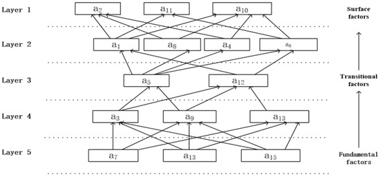 If “Ri ∩ Ai = Ri” is satisfied, the reachability set of Ri is completely included in the antecedent set of Ai. In other words, for all indicators in Ri, the antecedents of Si can be found in Ai. Other indicators can reach the indicator Si, while Si cannot reach other factors. Accordingly, all elements in Ri form the set of indicators, and the corresponding row and column are deleted from the matrix D. Class division is used to divide different indicators into different levels. Finally, the hierarchical structure network can be determined.
