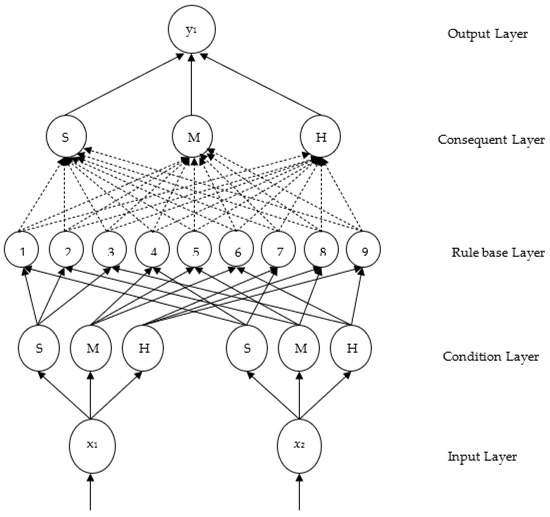 Schematic structure of POP-FNN for two inputs—one output scenario using three fuzzy labels of low (L), medium (M), and high (H).