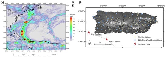 Hurricane Fiona track and location of rainfall measuring stations. (a) Complete six-hour timestep track for Hurricane Fiona (19–24 September 2022) and accumulated rainfall estimates from the Global Precipitation Mission [https://gpm.nasa.gov/data; accessed on 1 November 2022]. (b) Relief map of Puerto Rico showing Hurricane Fiona’s track in the vicinity of Puerto Rico and the location of weather stations measuring 1 h and 24 h rainfall intensities and total rainfall.