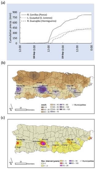 At approximately 8690 km2, PR (18.25° N, 66.50° W) is the smallest and easternmost island of the Greater Antilles. PR’s maritime tropical climate typifies that of all four main islands (i.e., Cuba, Jamaica, and Hispaniola). The island-wide mean annual temperature in PR is ~30 °C. The mean annual rainfall is 1690 mm yr−1 and ranges from ~700 mm yr−1 in the southwest part of the island to ~4600 mm yr−1 in the northeast, with ~45% occurring during the peak of the TC season from August to October []. Although not all of the largest individual rainstorms in PR are TC-related [], TCs yielding an excess of 50 mm in mean island-wide rainfall occur on average 5 to 6 times per decade []. PR-specific climate change projections suggest an increase in the frequency and magnitude of events yielding an excess of 76 mm of rainfall [,]. Major TC landfalls (>3 on the Saffir-Sampson TC wind scale) have occurred once every five to six decades []. However, TC rainfall does not depend on TC magnitude or proximity to the low-pressure center but is determined by the amount of precipitable water in the atmosphere, ground elevation, and event duration []. Even though the largest amounts of TC rainfall have typically occurred in the eastern, southeastern, and central interior portions of the island [], rainfall is largely dependent on the specific interactions of internal TC moisture with topographical features [], and intense rainfalls and high Qpa values can occur throughout the entire island [].