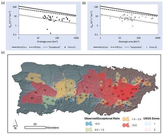 Watershed-by-watershed area-normalized instantaneous peak flow (Qpa) during Hurricane Fiona. (a) Drainage area versus Hurricane Fiona Qpa values for watersheds in Puerto Rico’s Zone 1 (western zone) relative to exceptional flows (Equation (5)), the world flood envelope (Equation (6)), and Puerto Rico’s flood envelope (Equation (7)). (b) Drainage area versus Hurricane Fiona’s Qpa values for watersheds in Puerto Rico’s Zone 2 (eastern zone) relative to exceptional flows, and the world’s and Puerto Rico’s flood envelopes. (c) Watershed-by-watershed distribution of ratios for Hurricane Fiona.