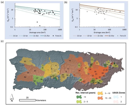 Watershed-by-watershed evaluation of Hurricane Fiona’s area-normalized instantaneous peak flows (Qpa) relative to estimated recurrence intervals []. (a) Drainage area versus Hurricane Fiona Qpa values for watersheds in Puerto Rico’ss Zone 1 (western) relative to estimated recurrence intervals (Equations (8a)–(8d)). (b) Drainage area versus Hurricane Fiona Qpa values for watersheds in Puerto Rico’s Zone 2 (eastern) relative to estimated recurrence intervals (Equations (9a)–(9d)). (c) Watershed-by-watershed distribution of Hurricane Fiona’s Qpa values with respect to estimated recurrence interval.