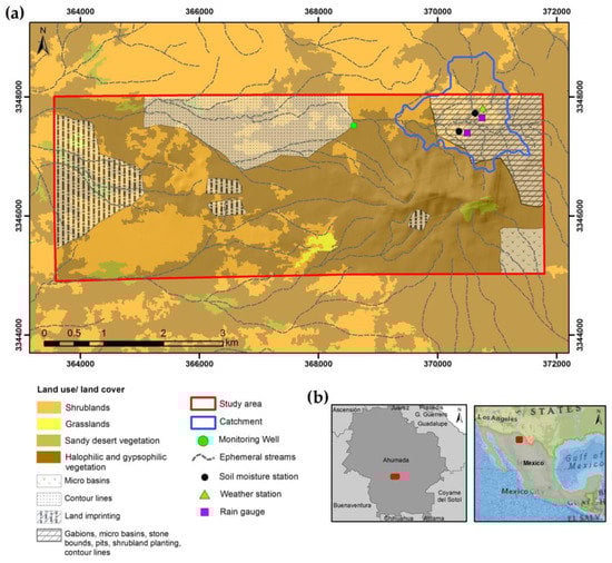 Location and instrumentation of the study site. (a) Study area showing ephemeral streams, catchment, and land cover, (b) Location of the study area within the municipality of Ahumada (left) and the country of Mexico (right). This map was created using ArcGIS 10.5® software. ArcGIS® is the intellectual property of ESRI and is used herein under license. Copyright © ESRI. All rights reserved. For more information about ESRI® software, please visit www.esri.com (accessed on 10 September 2022). Basemap credits: ESRI, DigitalGlobe, GeoEye, i-cubed, USDA FSA, USGS, AEX, Getmapping, Aerogrid, IGN, IGP, swisstopo, and the GIS User Community.