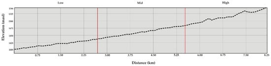 The relationships between vegetation and other environmental variables over time were evaluated using monthly-average NDVI and NDII data, which were compared against precipitation (P), air temperature (T), depth to groundwater (G), and θ. To assess the interannual variability of vegetation with NDVI and NDII, we selected imagery collected from August to October in each year. As described in Ni [], the highest biomass production peak is typically exhibited in these three months. To reduce potential errors in vegetation index estimates attributed to spatial heterogeneity, we divided the area into three distinct zones (high, mid, and low elevation) based on the altitudinal gradient observed at the study site (Figure 2). The high elevation zone ranged from 1485 to 1546 masl, the mid-elevation from 1437 to 1485 masl, and the low elevation from 1404 to 1436 masl. The three elevation zones were determined using the natural breaks classification method [] for the digital elevation model.