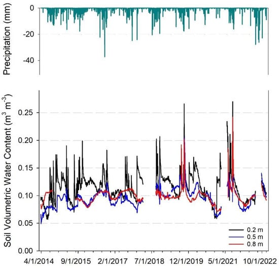 Daily precipitation and daily-average soil volumetric water content (θ) for all sensors at each of 0.2, 0.5, and 0.8 m depths from 26 March 2014 to 2 December 2022.