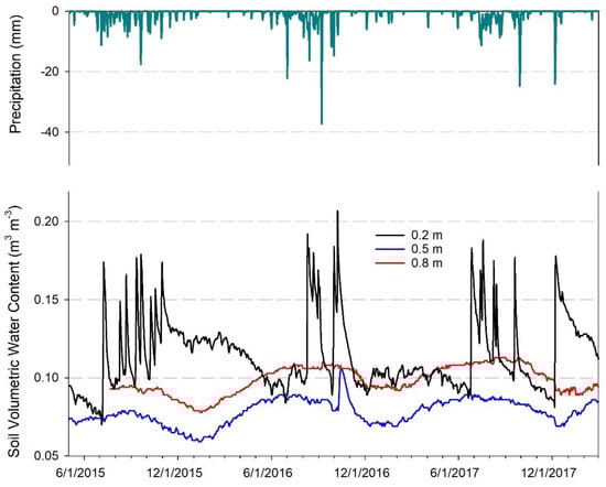 A closer look at the relationships between P and θ can be observed in Figure 4, which depicts daily P and θ level variability spanning three summer seasons (2015 to 2017) for the North soil water station. A sharp rise and decline in θ can be observed for the sensor at the 0.2 m depth. A less pronounced, steadier rise that generally peaked between July and August for the 0.5 m sensor and between September and October for the 0.8 m sensor was noted for most years. A storm event in October 2016 resulted in a significant rise in θ levels for the 0.5 m sensor. The higher θ levels observed at 0.8 m than at 0.5 m were attributed to finer-textured soil, which consequently increased water holding capacity, noted at that depth during sensor installation.