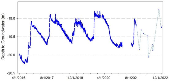 Daily maximum groundwater levels obtained from hourly or bi-hourly records from 1 April 2016 to 16 December 2022. Dashed lines indicate potential groundwater level trajectory connecting manually measured data points in late 2021 and 2022.