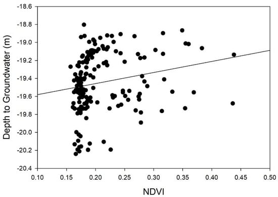 In arid and semiarid regions, vegetation cover is highly correlated with groundwater availability []. Similar to our results, Zhu et al. [] reported that precipitation increased the NDVI, leading to a groundwater rise during the wet years in an arid and semiarid region of China. Conversely, the severe drought conditions experienced during the year with the lowest precipitation (2020; 120 mm) were reflected in the deepest G (20 m) and lowest NDVI (0.17) values obtained for the entire period of study. The positive trend in G levels obtained at the study site differs from the drop in groundwater levels reported [] for most of the regional aquifer in 2010.