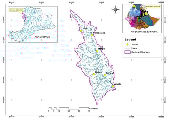 This study was conducted in the Borkena Catchment, which is located in the Awash River Basin in Ethiopia (Figure 1). The catchment covers a total area of ~1606 km2. It is geographically bounded between 39.3° and 39.7° longitude and 10.2° and 11.3° latitude.