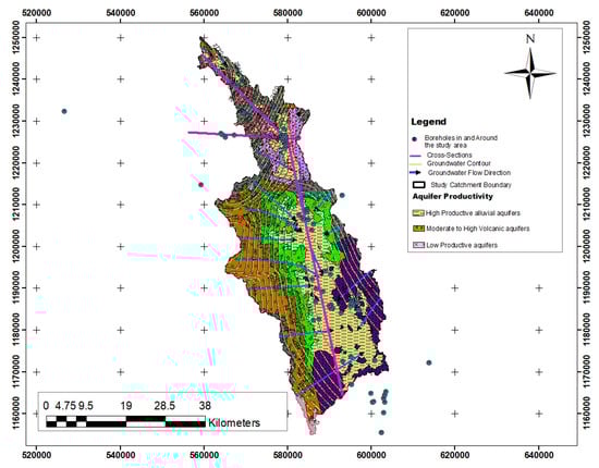 Such a geological formation causes distributed discharge along the central and lower parts of the Borkena River through the confining thin (10 m) layer of clay []. Based on the KCVTW-02-19 and KCVTW-03-19 well completion reports [,,,], three boreholes were drilled 500, 600, and 512 m deep, and the alluvial aquifer thickness was found from 230 to 250 m. As of the data from the KCVTW-01-19 and KCVTW-02-19 well completion reports, the hydraulic conductivities of the volcanic aquifers in the two boreholes were calculated and were nearly similar and large enough to transfer water from one region to another region [,,,]. These unpublished report data were used for this study to process the existing borehole data for the calculation of the aquifer properties and the physicochemical analysis using aquifer test and aquacheme software, analyzed and discussed in the Section 3. The borehole data were collected from the Ethiopian Construction Design and Supervision Works Corporation, Water and Energy Design and Supervision Works Sector [,,,], and via field monitoring. Moreover, this study measured the additional water level of the boreholes using a deep meter to develop the hydrogeological, cross-section, and groundwater contour and flow maps.
