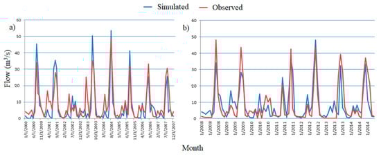 Monthly observed and simulated stream flow: (a) Calibration period, (b) validation period.