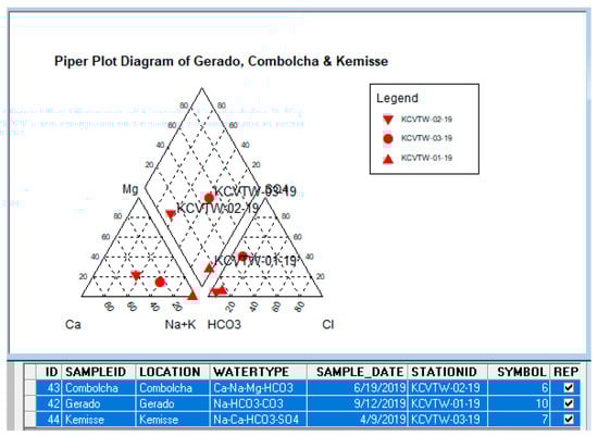 Although the Gerado Catchment (Abbay basin) is located at a higher elevation and the Combolcha and Kemisse (Awash) aquifers are located at lower elevations, it was assumed that there was no inter-basin groundwater flow between the two basins due to the very low hydraulic conductivity of the tertiary volcanic rocks, but this study suggests that there is an inter-basin transfer of groundwater from the Abbay to the Awash basins. This was also confirmed by the results from the physicochemical analysis, which showed an HCO3 compound in all of the three deep boreholes, except for changes in chemical composition, which likely occur due to the evolution during the inter-basin transfer process. A piper diagram was used to identify the chemical relationships among the water samples from the different boreholes. The water type at Gerado/Abbay basin (KCVTW-01-19), Combolcha/Awash basin (KCVTW-02-19), and Kemisse/Awash basin were Na-HCO3, Mg-Ca-Na-HCO3, and Na-Ca-HCO3-SO4, respectively (Figure 7). Due to the geochemical process in the groundwater flow, the Na-HCO3 water type in the Gerado catchment was likely changed to the Mg-Ca-Na-HCO3 type when it reached the Combolcha Catchment and, subsequently, to Na-Ca-HCO3-SO4 as it reached the Kemisse Catchment.