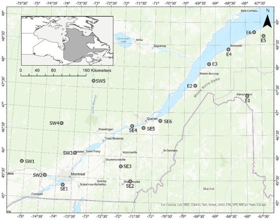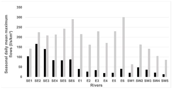 Daily means maximum flow (expressed as specific flows) in winter and spring are shown in Figure 2. In winter, the highest flow values were observed in the southeast hydroclimatic region (SE1 to SE6) south of 47° N on the south shore. The mean values of these flows were greater than 80 L/s/km² in this region, but less than 50 L/s/km² in the other two hydroclimatic regions (E1 to E6 and Sw1 to SW5). In spring, the mean flow values of rivers in the southwest hydroclimatic region (SW1 to SW5) on the north shore of the St. Lawrence River were lower than those on the south shore. These means were all below 179 L/s/km², but most rivers on the south shore far exceeded this threshold (Figure 2).
