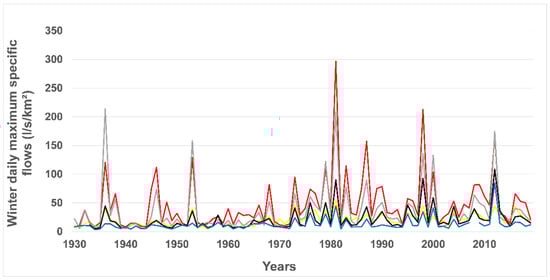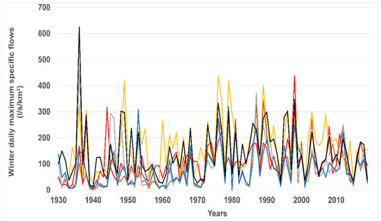 The application of two tests (Pettitt and Lombard) to detect the breaks in the averages highlighted by the previous tests reveals that these breaks are almost abrupt, and all occurred before 1973 (Table 5). To verify whether winter and spring daily maximum flow series were affected by a second break in means, the six statistical tests were applied to analyze the series from 1975–2019. No changes were detected in the long-term trend or in the break in means (these results are not presented here). Therefore, the wet period of the 2010s, which was characterized by high-intensity freshets, did not significantly affect the means of the hydrological series.