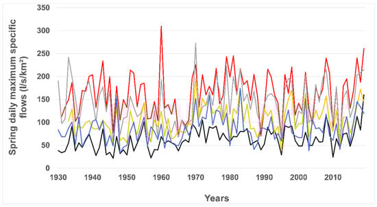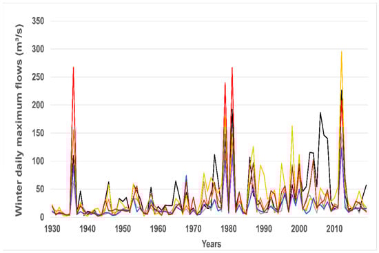 We used nine different statistical tests to compare the long-term trend of daily maximum flow in winter and spring. These tests are described in detail in the scientific literature (e.g., [21,22,23,24,25]). This temporal variability analysis was carried out in the following steps: