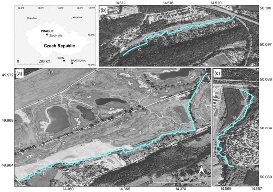 Study area. Restored streams of the (a) Lipanský (LIP) brook, (b) Rokytka (ROK) brook, and (c) Hostavický (HOS) brook in Prague, Czech Republic, with marked stream reaches used for the assessment of geometric properties.